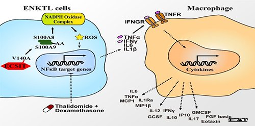 该研究利用高通量测序技术联合质谱分析平台,在88例NK/T细胞淋巴瘤病人的肿瘤样品中发现17例样品的ECSIT(Evolutionarily Conserved Signaling Intermediate in Toll pathways)基因所编码蛋白存在V140A(第140位缬氨酸(Val)突变为丙氨酸(Ala))的突变。ECSIT基因的V140A突变导致肿瘤细胞的NF-κB 信号通路持续激活,并分泌多种细胞因子。研究发现,V140A突变型ECSIT激活NF-κB 信号通路主要通过促进钙结合蛋白S100A8和S100A9形成稳定的二聚体并增强NADPH氧化酶的活性而完成。肿瘤细胞NF-κB 信号通路激活后分泌的炎症因子(主要为TNFα和IFNγ)会进一步促进肿瘤周围巨噬细胞的激活并分泌大量细胞因子,形成“细胞因子风暴”。进一步的研究发现,地塞米松和沙利多胺的联合用药能有效抑制ECSIT V140A突变引起的过度炎症反应。并在临床运用初步验证了这一联合用药治疗方案在控制“噬血综合症”中的可行性。