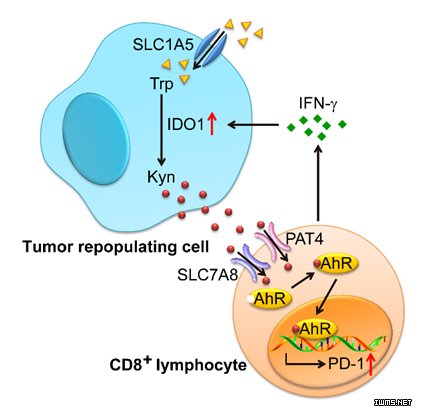 色氨酸作为一种必需氨基酸,其在体内不仅通过代谢生成5-羟色胺和褪黑素等重要活性分子,而且能够通过吲哚胺-2,3-双加氧酶(indoleamine 2,3-dioxygenase,IDO)催化产生犬尿氨酸(kynurenine, Kyn)直接激活胞浆转录因子芳香烃受体(aryl hydrocarbon receptor, AhR)。黄波教授课题组前期研究发现,高成瘤性的肿瘤再生细胞(Tumor repopulating cells,TRC)中,IDO-Kyn-AhR通路非常活跃,而T细胞释放的免疫因子IFN-γ则进一步激活此通路,诱导TRC进入休眠(Nat Commun. 2017;8:15207);另外该课题组还发现抗病毒的免疫因子IFN-β同样激活此通路,并更强地诱导TRC休眠(J Clin Invest. 2018;128:1057-1073)。T细胞可以通过IDO-Kyn-AhR通路调控TRC,TRC是否反过来也可以调节T细胞呢?对此,课题组通过将活化的T细胞和肿瘤细胞共培养,发现活化的T细胞不但无法杀死TRC,反而上调PD-1表达,提示TRC能够调节T细胞PD-1的表达。进一步研究发现,T细胞释放的IFN-γ促进TRC显著上调色氨酸转运蛋白以及IDO,使得色氨酸大量进入TRC并代谢为Kyn;Kyn被TRC释放到细胞外后,通过T细胞膜表面的Kyn转运子,又进入到T细胞内,从而激活T细胞的AhR,AhR入核后直接结合PD-1启动子,启动PD-1的表达(如图)。该研究发现,在理论上加深了当前对肿瘤免疫的认识,而且有望发展新的肿瘤免疫治疗策略。