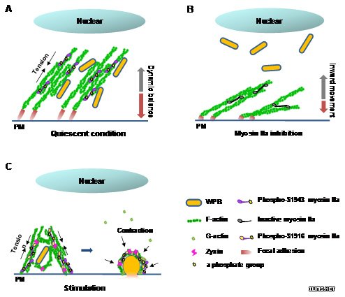 图. 肌球蛋白Myosin IIa调节cAMP诱导的内皮细胞中WP小体分泌的变阻器模式。